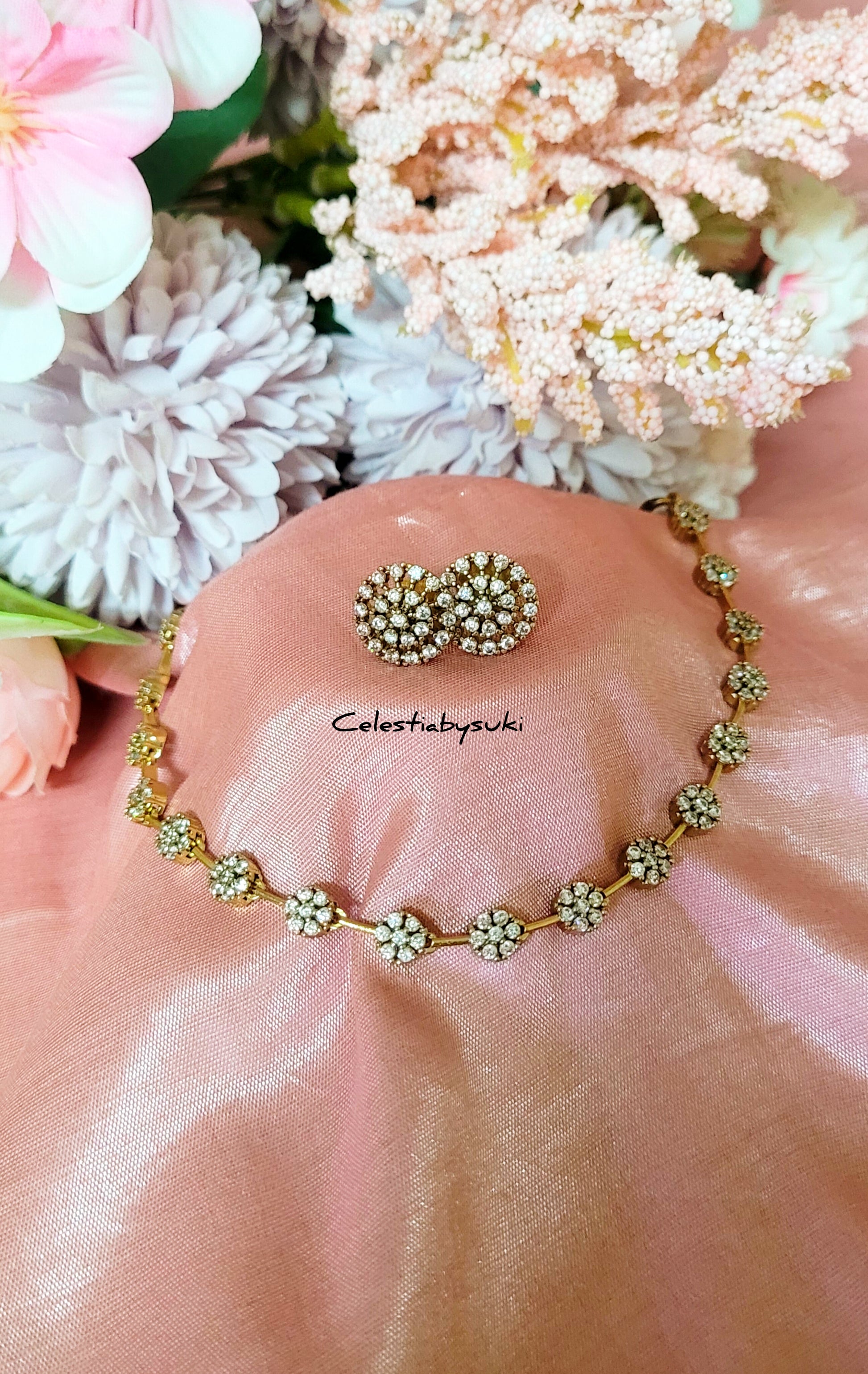 Bring timeless elegance to your look with the Daisy Glow Set, featuring a delicate floral-inspired necklace and matching earrings. Each sparkling cluster is crafted with shimmering stones on a gold-plated base, creating a graceful design that suits both festive and everyday wear. Lightweight, durable, and anti-tarnish, this set is the perfect blend of sophistication and charm.