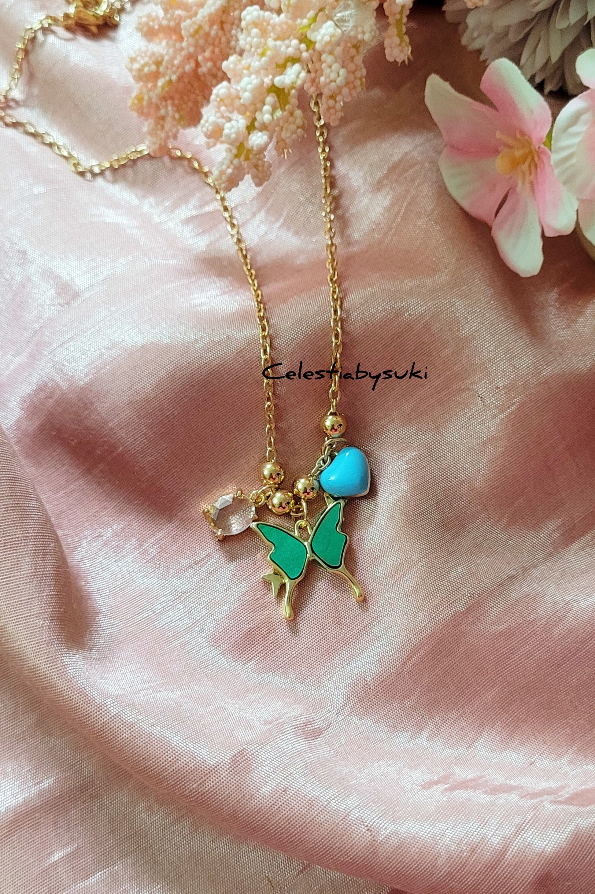 Add a touch of whimsy to your style with our Fluttering Heart Necklace. This charming piece features a graceful green butterfly, a bright turquoise heart, and a sparkling crystal charm – symbolizing love, freedom, and light. Crafted in anti-tarnish stainless steel with a golden finish, it’s a playful yet elegant accessory that pairs beautifully with any outfit. Perfect for dreamers and free spirits! 🦋💙✨