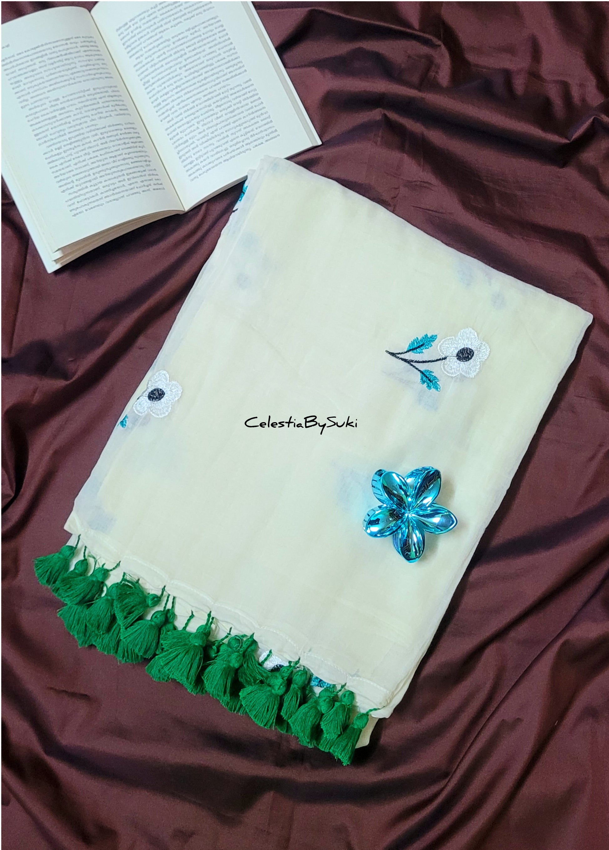 A serene blend of elegance and simplicity, our Shveta Pushpa Drapé features soft white mul cotton adorned with delicate hand-embroidered floral motifs. The saree is finished with playful green tassels that add a refreshing charm. Lightweight and breathable, it’s perfect for casual outings, festive gatherings, or as a graceful everyday wear that radiates effortless beauty. 🌿✨