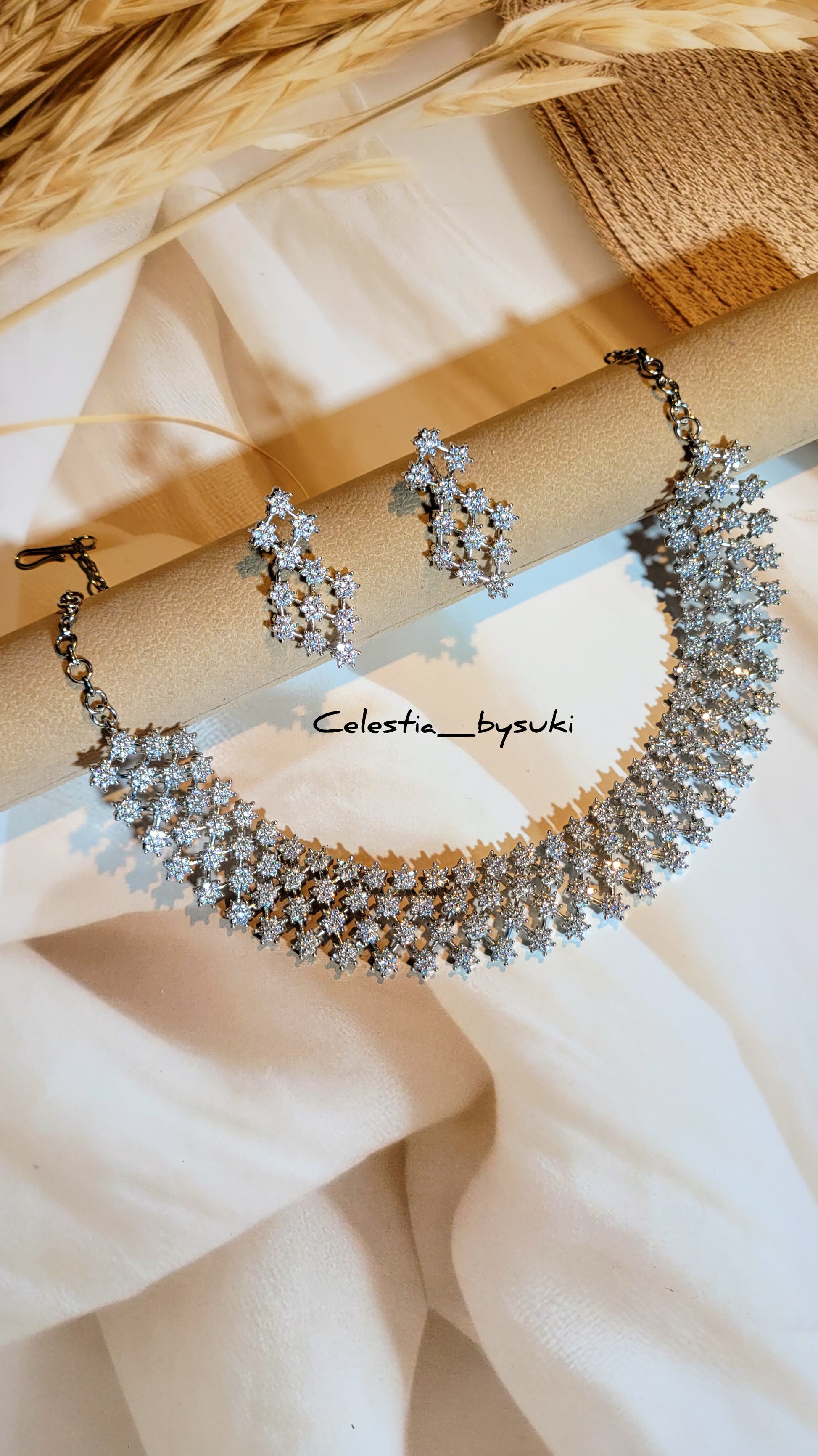 Step into your special day with the Ceila Bridal Set – a stunning diamond replica ensemble crafted to capture every sparkle of elegance. Lightweight yet luxurious, this set includes intricately designed necklace and earrings that promise a regal glow for your wedding or special occasion.